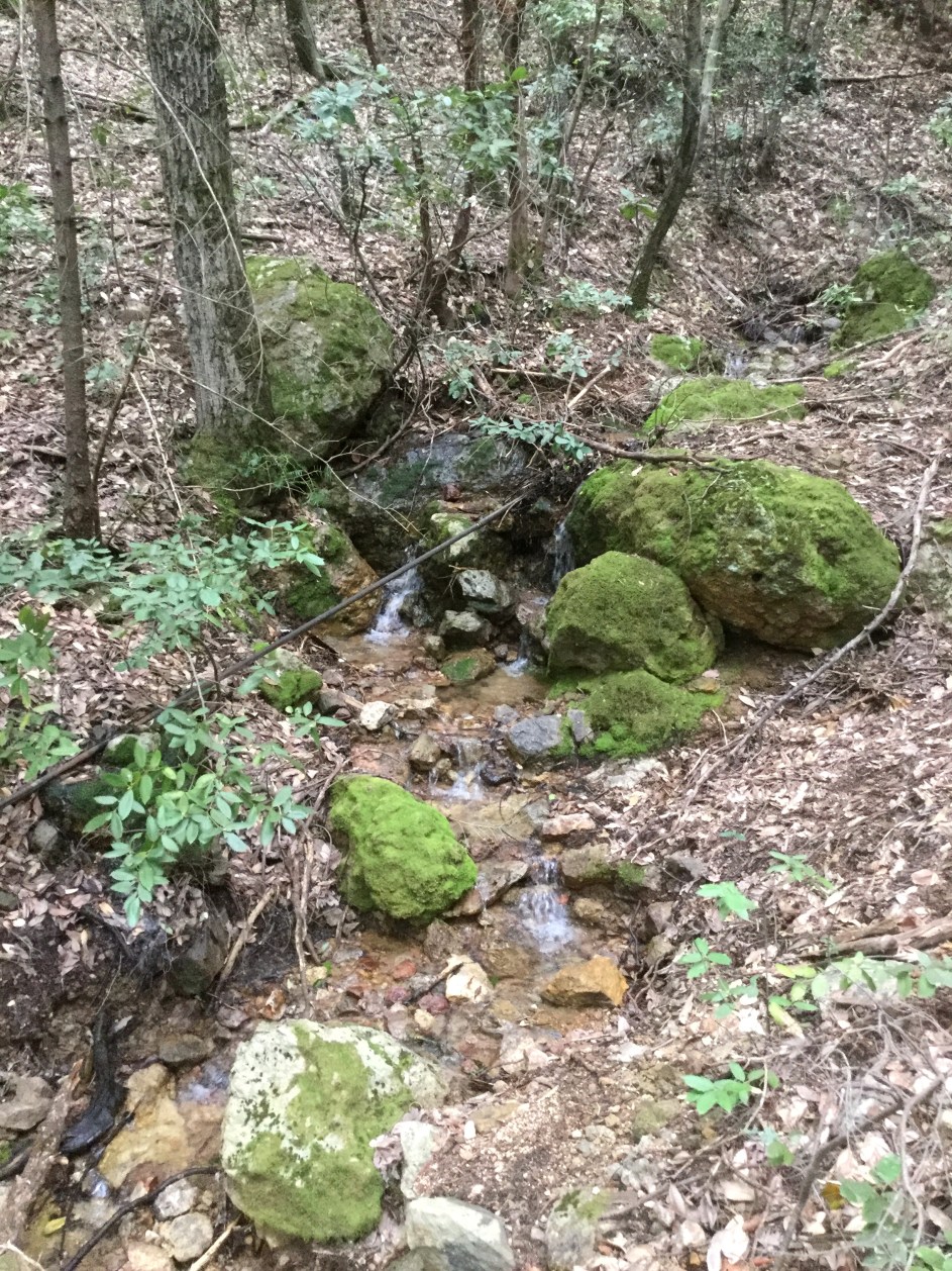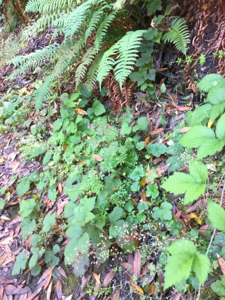 I backtrack to Doe Flat Day Camp near the park entrance and park my car there. As you’re entering the park on Juan Bautista Road, Doe Flat is to the left of the Fremont State Park entrance sign. The trailhead to Cold Springs Trail, on which I commence my hike, is across the street from the campground and through the gate, unmarked except on the park map. I had missed it when I first entered the park since it lacks a sign and because it’s so overgrown. Only a little, narrow, blurred strip of dirt marks the way that evidently few hikers take. It’s green and lush here, a gift of the winter and early spring heavy rains that ended our drought of the last few years. Miner’s lettuce, wood fern, thistle, various grasses, and maidenhair proliferate and revel in the joy of living. The trail is obliterated in many places by fallen trees, the less fortunate recipients of the storms. At one point, I use my head as a battering ram to get through the branches that my hands are already too full to push aside. I’m grateful for my new red sun hat, broad-brimmed and made of a not too heavy but very sturdy synthetic material. It keeps my hair free from the tangling twigs and my shoulders free from scratches. Its bright color will also serve to mark the site of my remains if I am one of those few Californians that make a meal for a mountain lion every two decades or so, if such an enterprising feline takes advantage of my aloneness on this solitary trail. My shins and ankles, however, are shit out of luck.