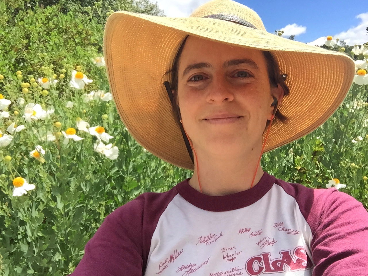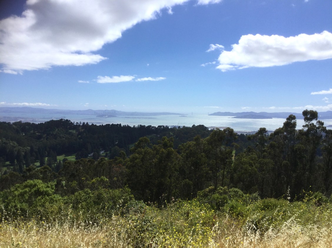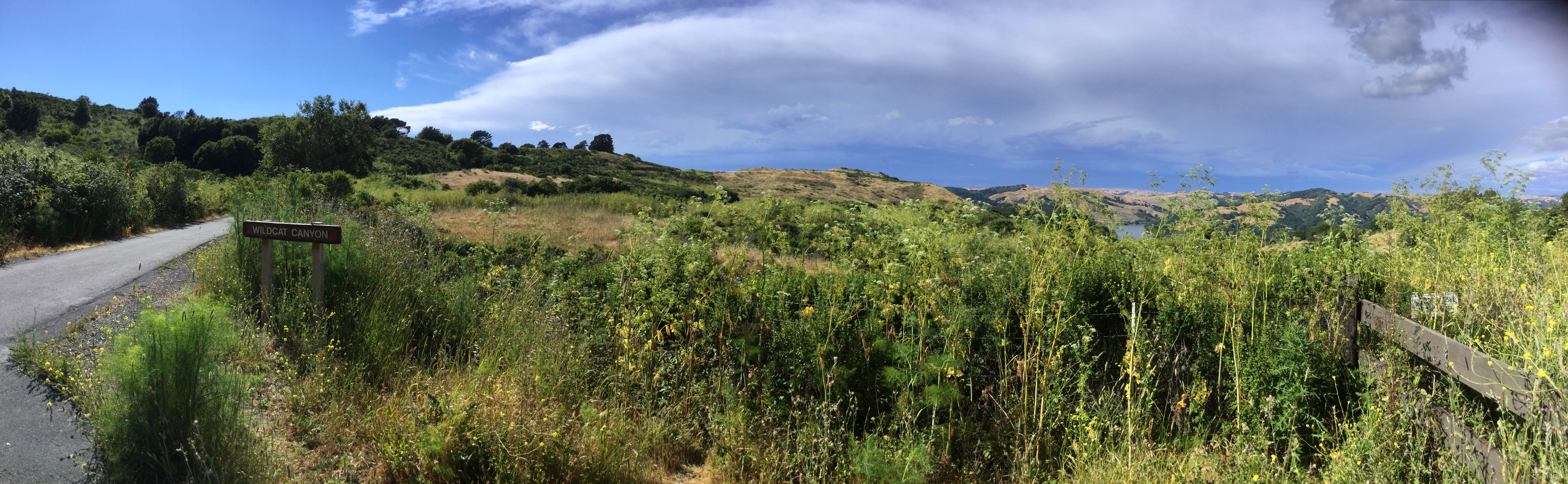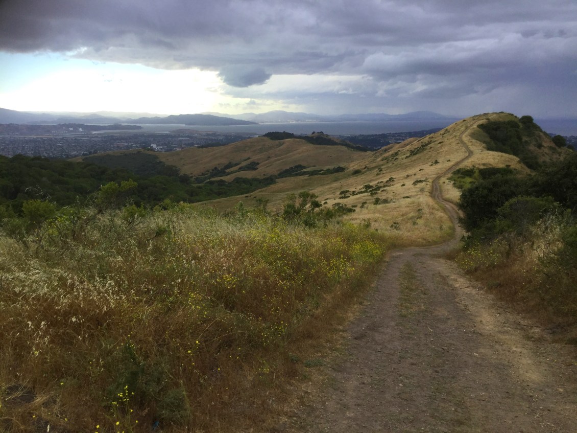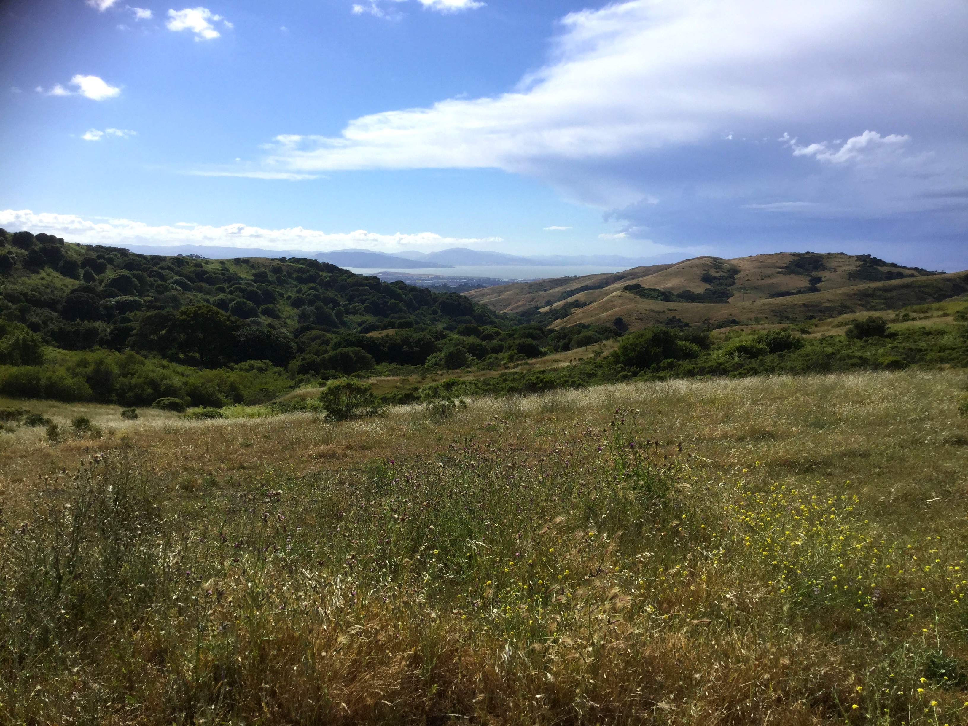 It’s a beautiful morning here in Chabot, sunny and a little cool. The blustering winds of yesterday have given way to occasional gentle breezes. The poppies are still closed. The cottontails hop across the trail: they emerge in the cool of the morning and the early evening and are as plentiful as, well, rabbits. Tall thistles are in bloom, and wild mustard, and lupine, and tall dandelions, and a flower that looks like Queen Anne’s lace, and sweet-smelling cones of pale pink flowers on a species of tree I can’t name. There’s a plentiful grass tipped with seed pods that arrange themselves in structures that look like rattlesnake tails, bending the stems over with their weight.