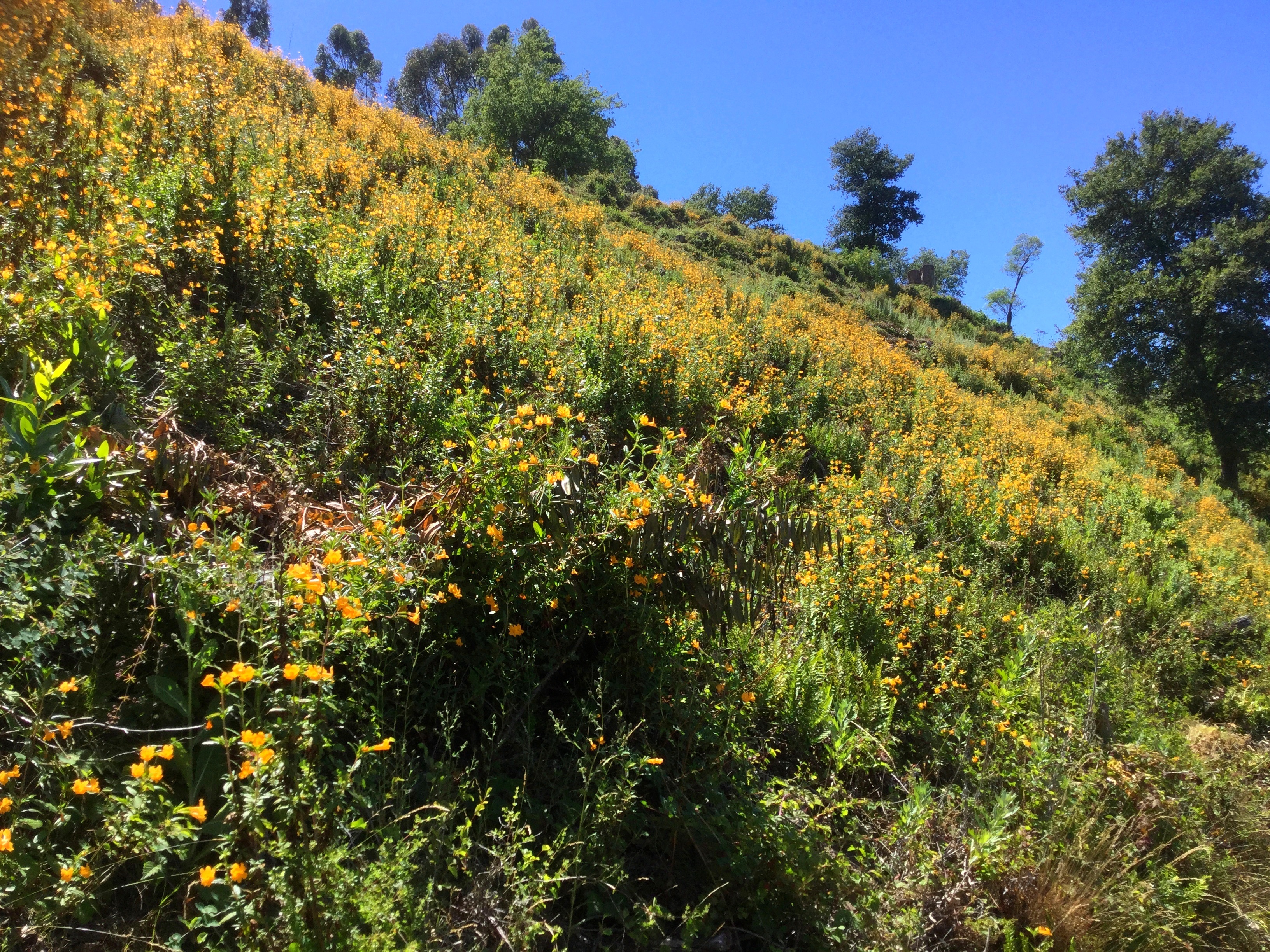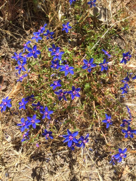 The wildflowers are not so thick now in most spots, though I can see the dried and shriveled evidence that they were not long ago. They may soon enjoy a second bloom from the straggler storm that passed through recently. Those still here are just beautiful, white, pink, yellow, purple, and blue. I see waxy yellow California buttercups, blue witch and blue-eyed grass, purple shooting stars and larkspur, golden poppies, white woodland stars, and many, many more. A woodpecker knocks overhead as other birds chatter, squawk, trill, and call with that ‘wheeeeeew’ sound that accompanies old-time comedy scenes.