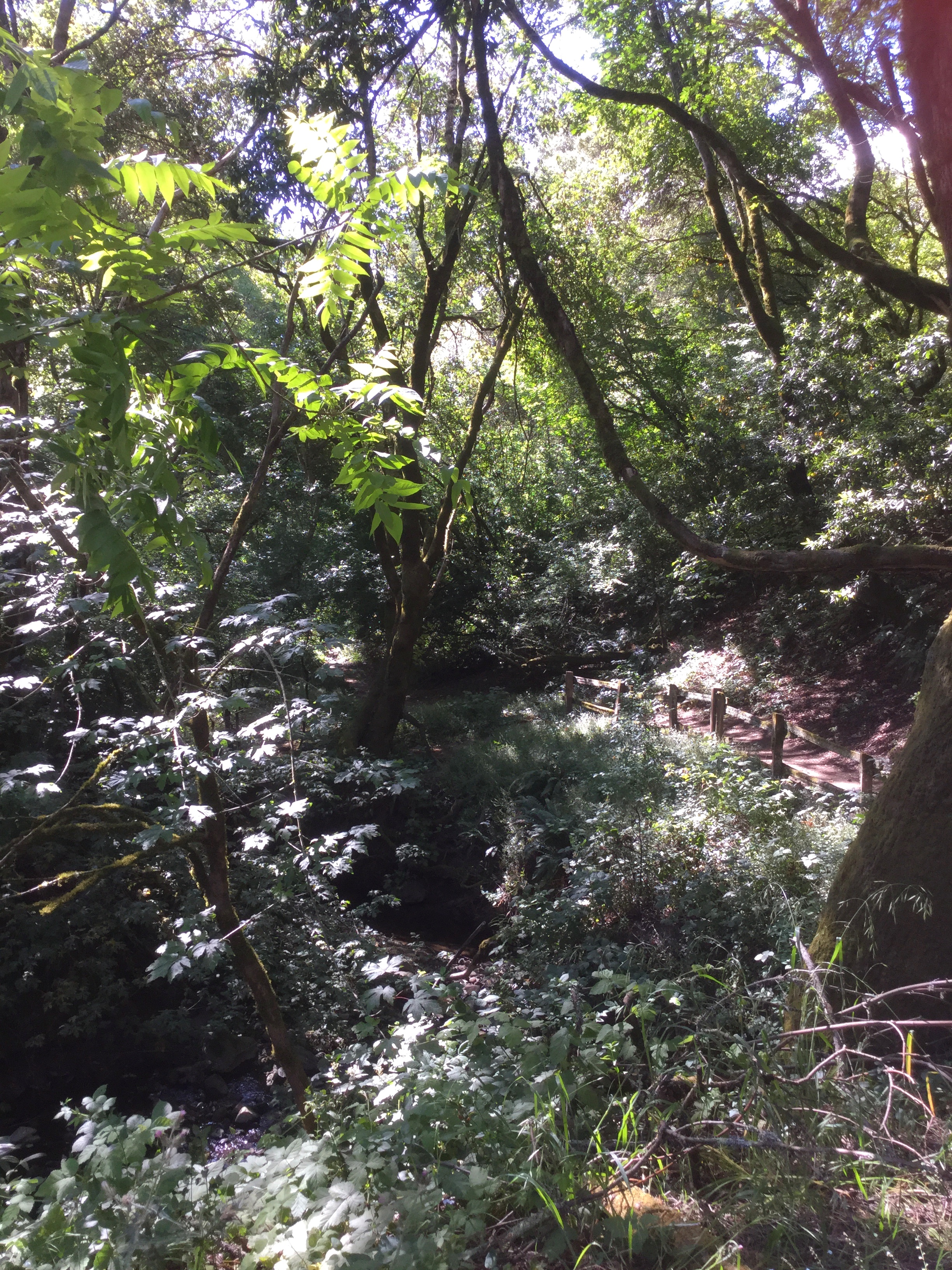 This morning, I walk north and east from Lake Chabot Golf Course shortly after seven thirty, then enter Chabot Regional at the end of Grass Valley Road in south Oakland, near the San Leandro and Castro Valley borders. I take Jackson Grade east and down to Brandon Trail, where I turn left just before the sweet little stone bridge that crosses Grass Valley Creek. I head north along the east bank of the creek.