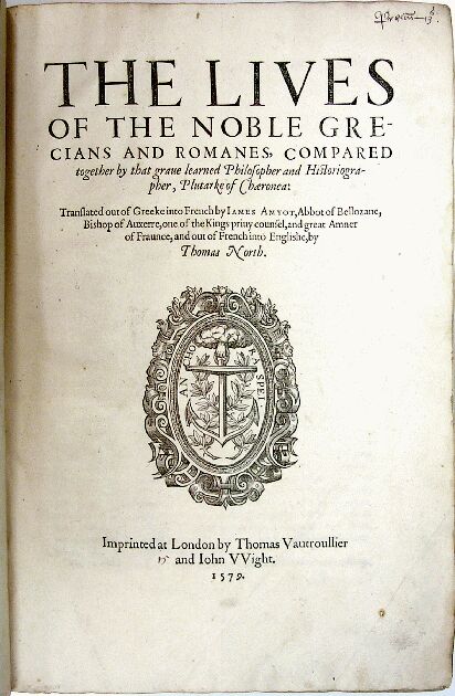 Title page of Thomas North’s translation of Plutarch’s Lives, 1579, first edition