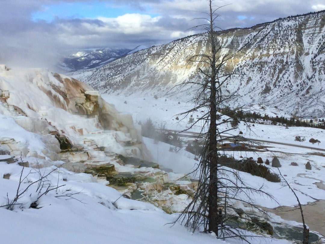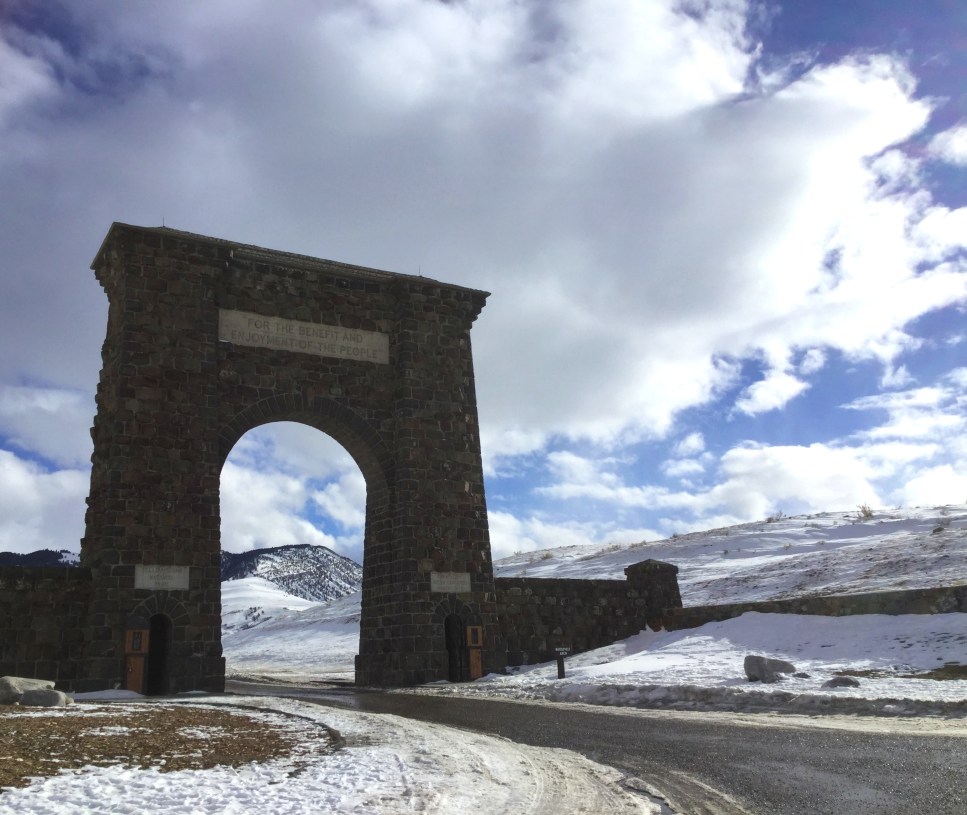 8, first visit – Yellowstone National Park, Wyoming, Montana, and Idaho. At the north gate’s Roosevelt Arch, Montana, January 2017