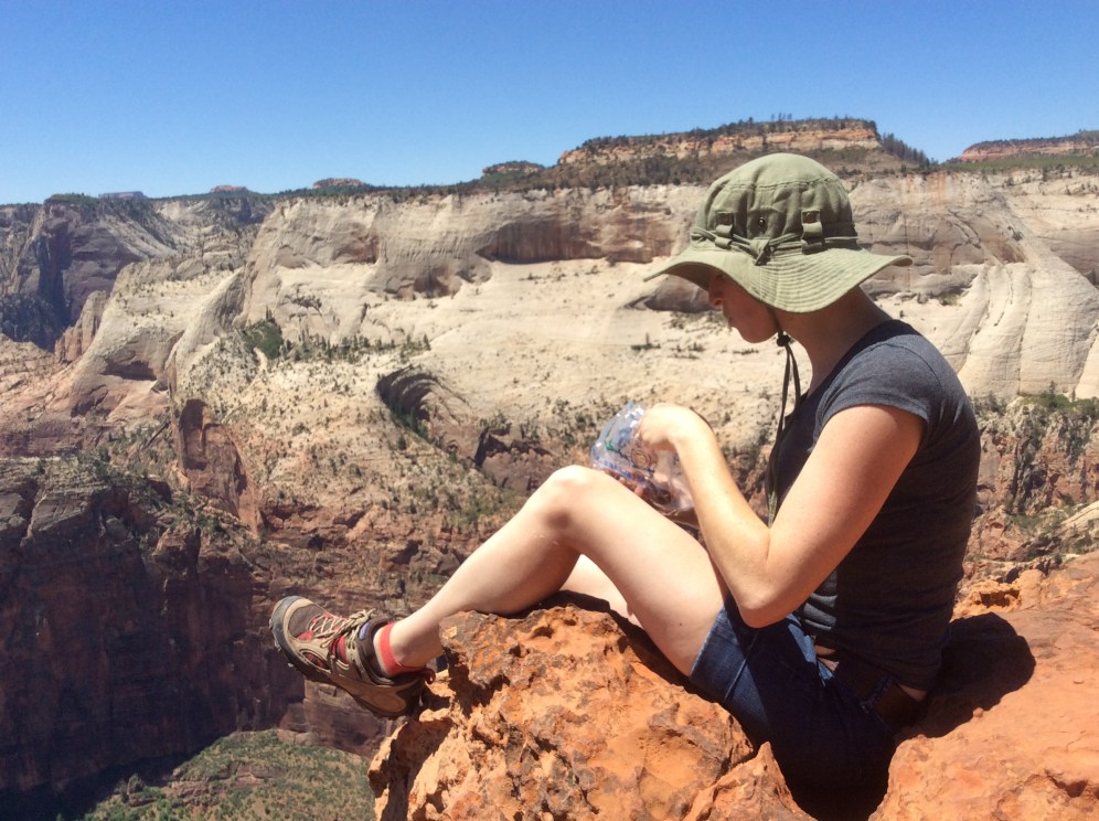 Enjoying cold milk (it’s a very good thermos) and salty bacon at after the hot, steep hike to Observation Point, Zion National Park
