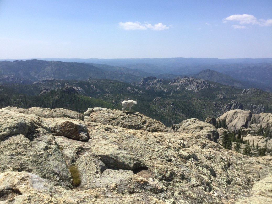 View of the Black Hills with a Rocky Mountain goat from Black Elk Peak, July 2017