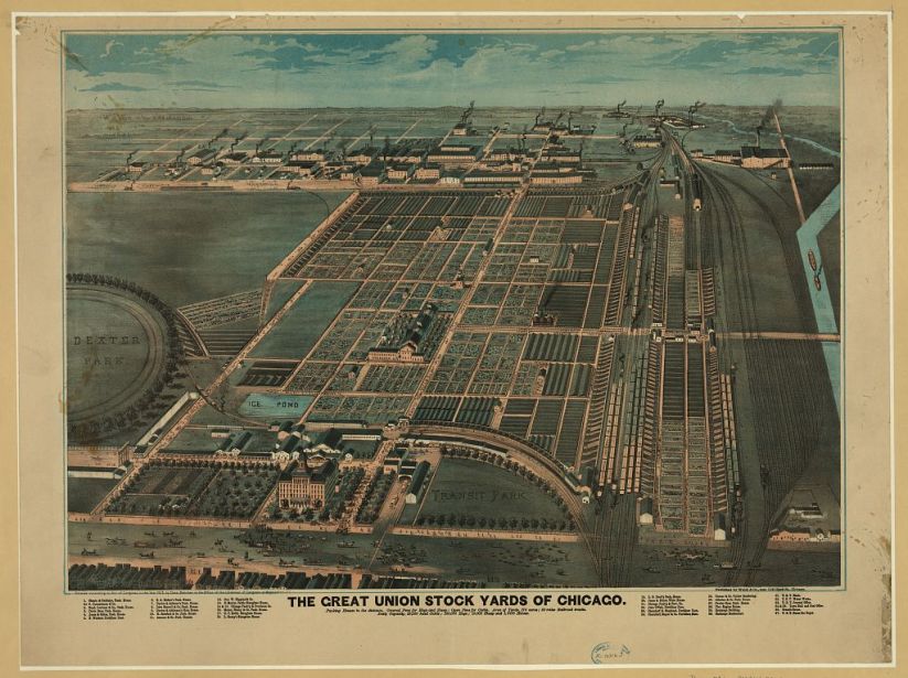 The Great Union Stock Yards of Chicago, ca. 1878, by Charles Rascher. Published by Walsh & Co of Chicago. Public domain via Library of Congress
