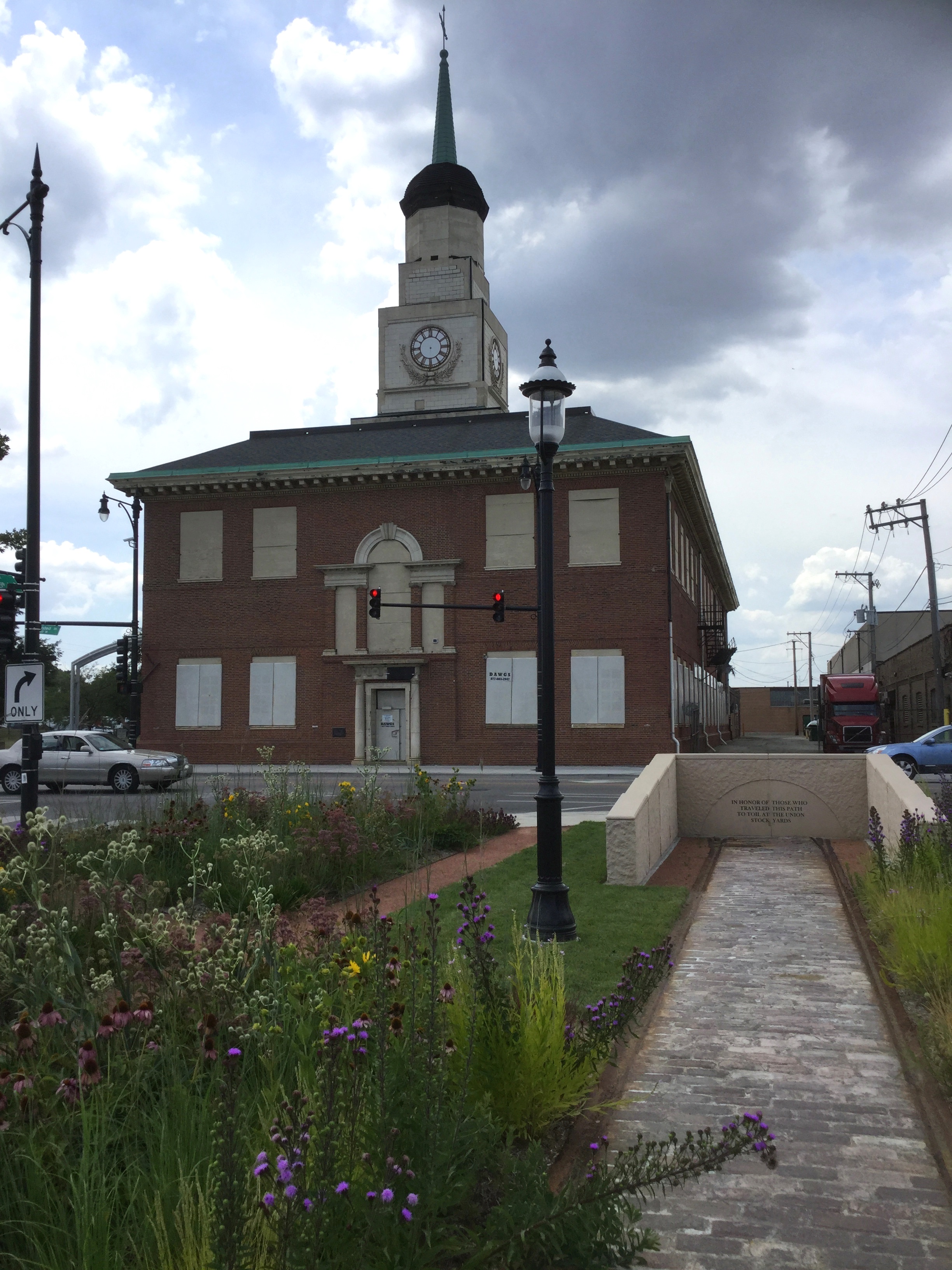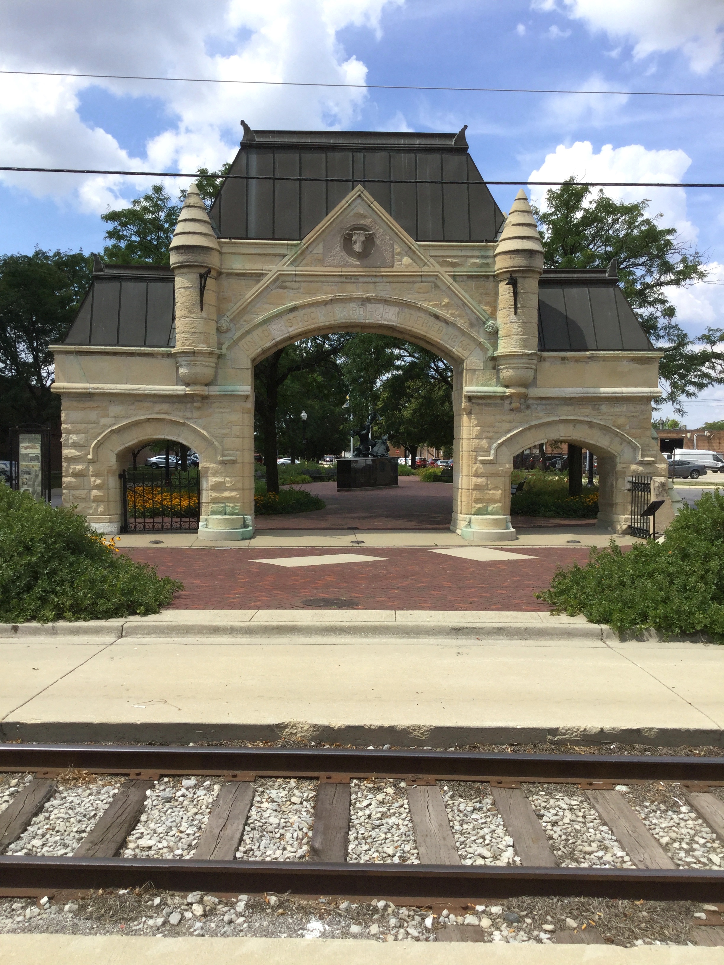 Stock Yards National Bank Building near the Union Stockyard Gate, Chicago, IL. The words inscribed in the arched niche in the low wall marking the old rail line read: ‘In Honor of Those Who Traveled this Path to Toil at the Union Stockyards’
