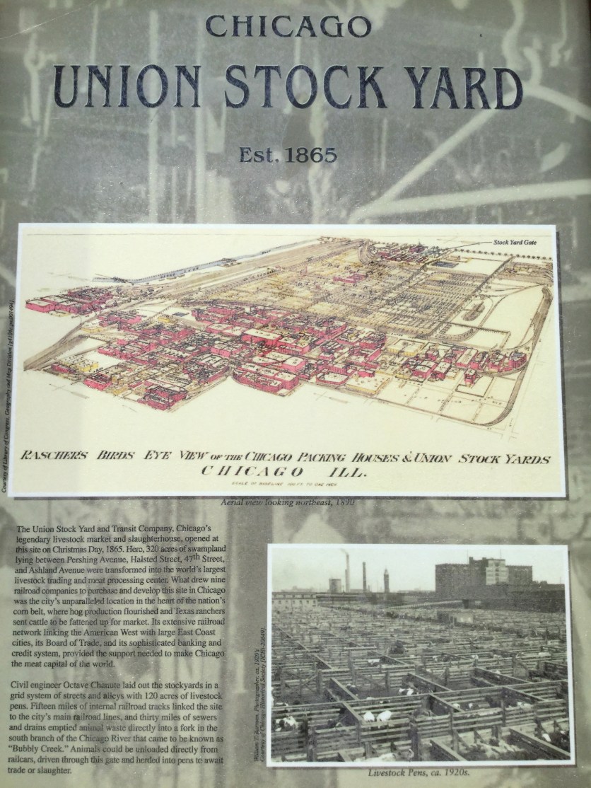 On June 1st, 1865, a crew of workmen began work on what would be the first example of modern industrial production of food on a massive scale. The Union Stockyards opened on Christmas Day that same year: ‘The Union Stock Yard & Transit Co. of Chicago received its first bellowing arrivals on Christmas Day 1865. …[It] covered a half square mile west of Halsted Street between Pershing Road and 47th Street- Anderson … [and] held on until 1971, when it closed forever…’, wrote Jon Anderson for the Chicago Tribune.