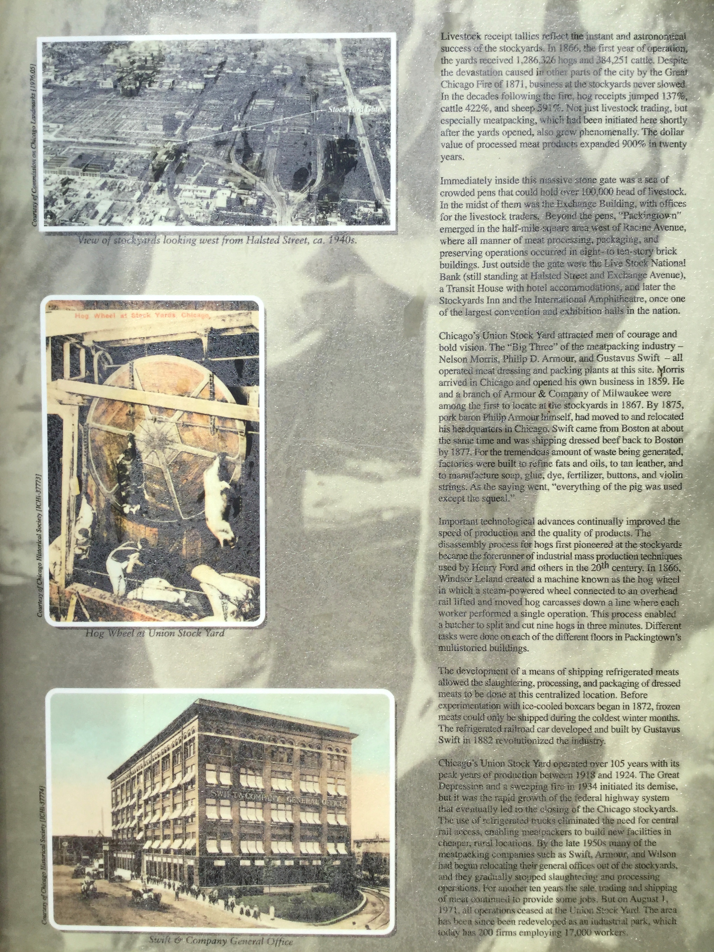 See below for links for more excellent introductory sources to the history of the Union Stockyards, and scroll down to see the two signs I find at the site which also provide a brief history.