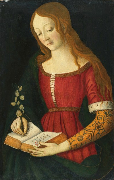 Young Lady Writing in an Hymnal by Giacomo Pacchiarotto, turn of 16th c, Siena, Italy