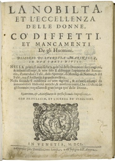 Title page of 1601 edition of Lucrezia Marinella’s La Nobilita, et L’eccellenza delle Donne
