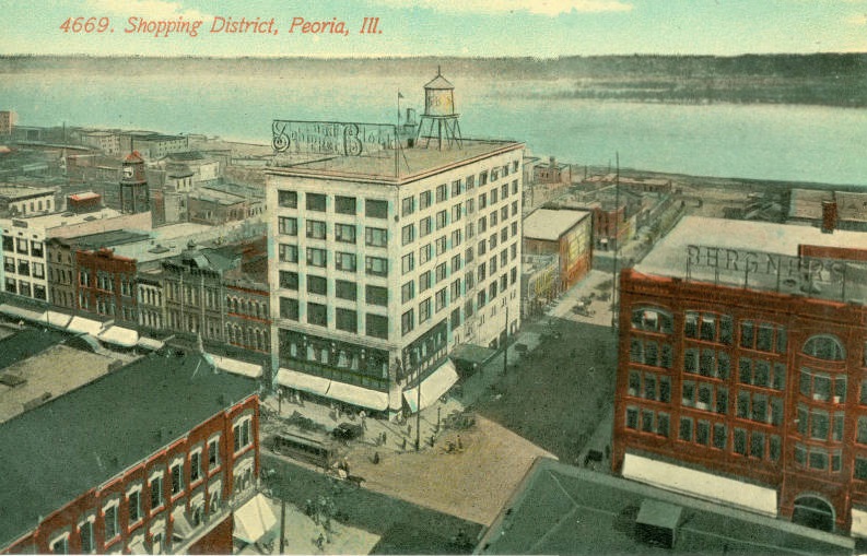 Aerial view of Adams and Fulton with the ‘The Big White Store’ Block & Kuhl, once Schipper & Block, now the site of the old Chase Bank Building and once the site of the old Clinton House, Peoria IL, Local History & Geneology Collection, Peoria Public Library