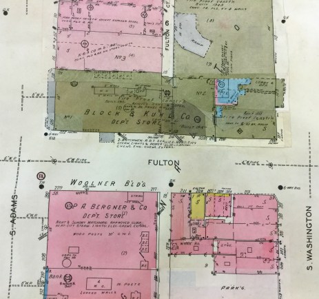 Adams and Fulton Sts detail, Insurance Maps of Peoria, Sanborn 1927, Local History and Geneology Room, Peoria Public Library