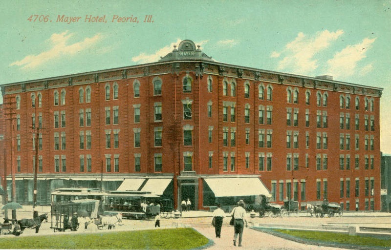 Mayer Hotel, 1907 to 1963, built at old Peoria House site at Adams and Hamilton, Peoria, Illinois