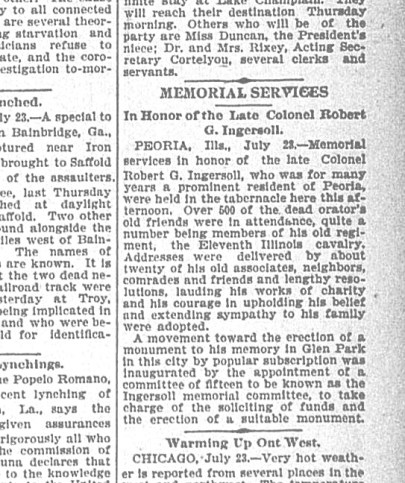 This was the site of the Tabernacle, a huge octagonal multi-purpose structure built in 1894. A memorial service was held here for Ingersoll on July 24th, 1899 three days after his death. He was not buried in Peoria; he had moved to Washington D.C. in 1878, once again opening a law office with his brother, and then moved back to his native state of New York in 1885. His ashes were interred in Arlington National Cemetary since he was a Civil War veteran. But Ingersoll was among Peoria’s most famous and treasured adopted sons, having lived here for a little over 20 years. So, it was wise to hold his memorial service in such a large space.