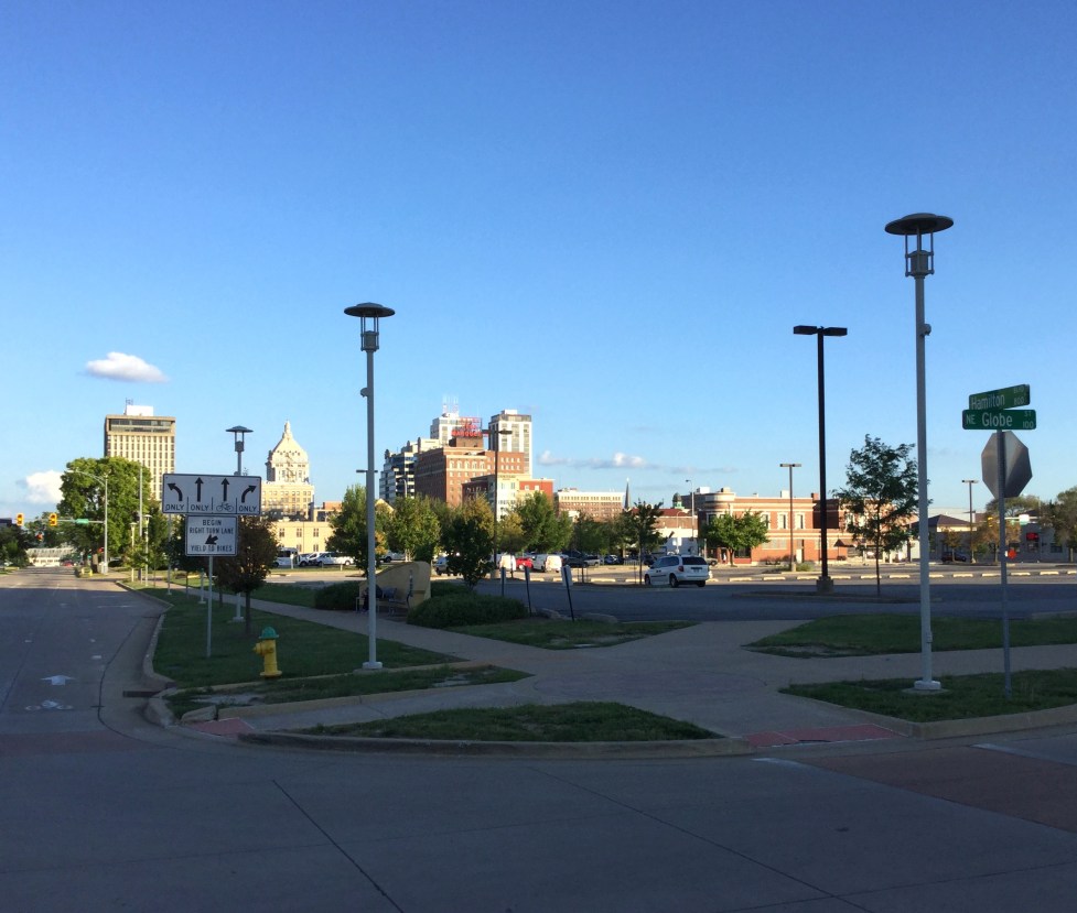 Facing the northeast corner of Globe and Hamilton, former site of the Tabernacle, Peoria