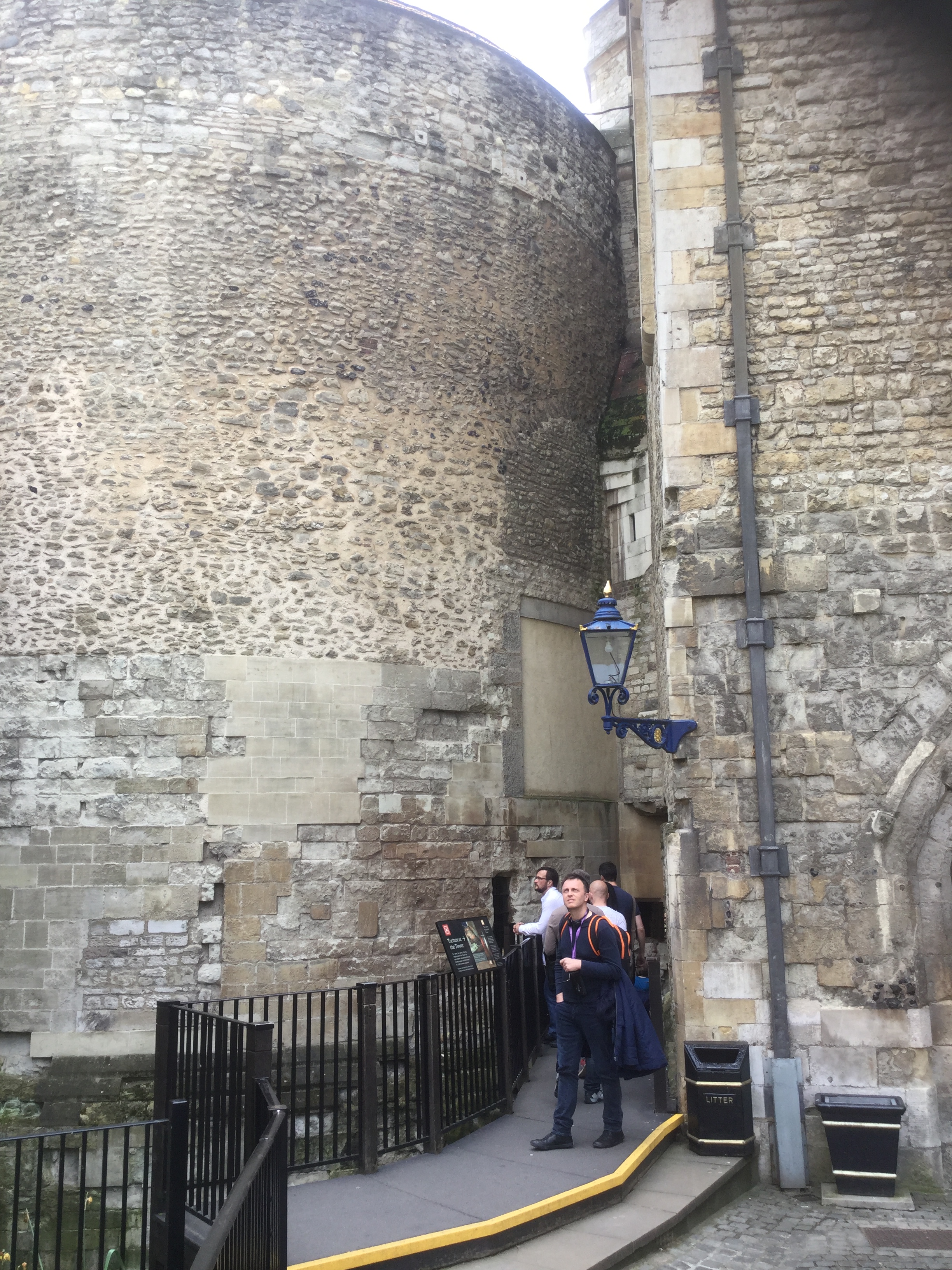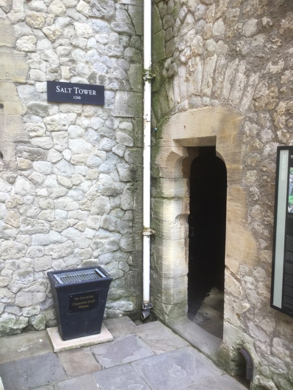 Turning left at St. Thomas’ Tower, we head for the Salt Tower at the southeast corner of the Tower compound. It was built in the 1230’s under King Henry III’s reign. Simon told us earlier today that this is the other prime candidate as the site of More’s imprisonment. It was also among the most secure chambers, so influential prisoners whose cases were most politically charged were often held here.