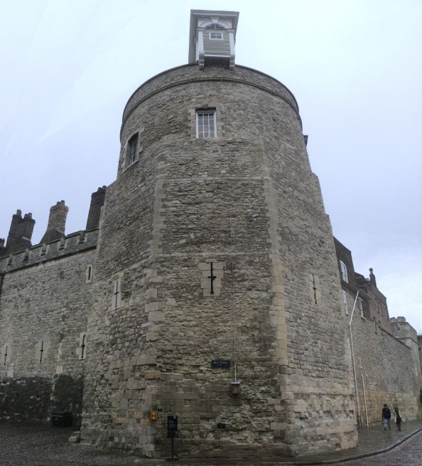 We leave the chamber and head toward the southwest corner of the Tower complex. On the way, we pass St. Thomas’ Tower, originally built in the 1270’s by Edward I, and the Traitors’ Gate below it. This is where both Elizabeth and More entered the Tower as prisoners. This wide arched entryway was built so that small boats could easily and securely enter the Tower and deposit their detainees. Then-Princess Elizabeth entered this archway by boat on March 18, 1554, as Mary’s prisoner. As discussed in the previous installment of my Tower visit story, Elizabeth had been connected to Sir Thomas Wyatt’s rebellion, the purpose of which was to prevent Mary’s marriage to King Philip of Spain and to place Elizabeth on the throne. Elizabeth was reported to have said as she entered this gate, ‘Oh Lord! I never thought to have come here as a prisoner; and I pray you all, good friends and fellows, bear me witness, that I come in as no traitor, but as true woman to the queen’s majesty as any is now living.’ As our guide Simon told us earlier today, the truth of Elizabeth’s protestation of total innocence is still debated to this day.