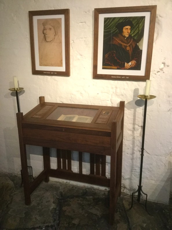 There are other reasons to think More may not have been held in this cell, at least not during the entire time of his imprisonment in the Tower. Historical researcher Stephen Priestley told the Guardian’s Maev Kennedy that Tower authorities tried to break up communication between More and fellow prisoner Bishop John Fisher, who was also opposed to the Act of Succession, much more openly so than More, and also thrown into the Tower for it. The cell above this one in the Bell Tower, which at the time could be reached by a narrow staircase from this one, was the one that held Fisher, or at least, probably did. This leads Priestly to surmise that Fisher and Thomas would have been eventually placed where they could not communicate so easily with one another. I also consider the stories that Simon and others tell of More rapping on the ceiling to get Fisher’s attention in the room above. But, as you can see yourself from the photos and as Simon points out today, this hardly seems possible in the Bell Tower cell, no matter how hard you might pound on the ceiling if you found a way to reach it at all. Perhaps, then, More and Fisher were held, at least for awhile, in neighboring cells where such communication was possible. Or perhaps, the ceiling-rapping stories are apocryphal and More and Fisher communicated only through smuggled notes and letters, as we know for certain they did.