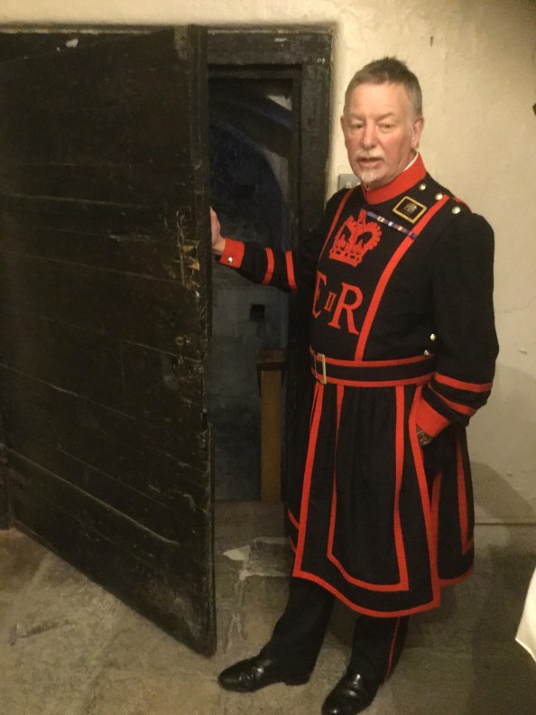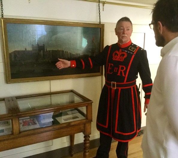 Yeoman Warder Simon Dodd arrives and greets us. He proves throughout our time together to be an extremely friendly, knowledgeable, witty, and all-around delightful man, and very generous with his time. I couldn’t have asked for a better host or conversational partner. Laurence is particularly interested and well-read in military history and Simon has had a long and distinguished military career, so, we all have a lot to talk about. I only hope, as we tour and talk, that my sleep-deprived brain can form intelligent questions and process his answers. I take no chances with its ability to successfully retain information: I take plentiful notes as we go. After introductions and a brief chat, we start right in on our tour.