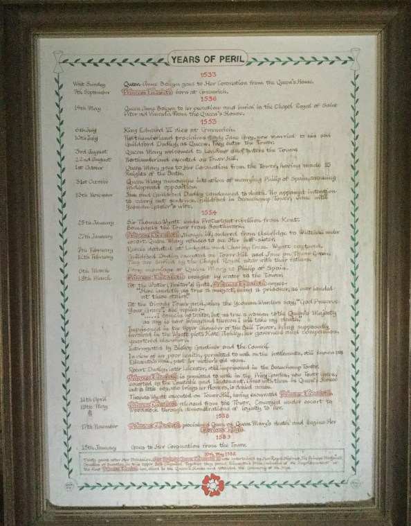 As we go down again, on our way out of the Bell Tower chamber, I spot a section of stone that’s been inscribed and covered with a protective clear covering of glass or plastic, and a black slate underneath it with a transcription, strapped to the wall. In answer to my question, Simon tells me there’s a tradition that it was carved when Elizabeth was imprisoned here but it’s not really known just who carved it. Both texts are both worn and difficult to read. Here’s my best attempt to decipher what they say: